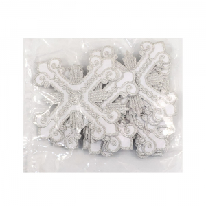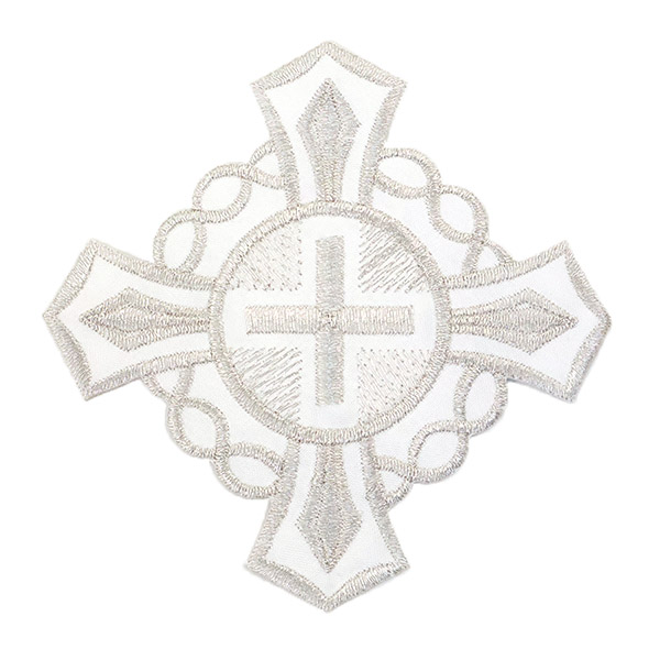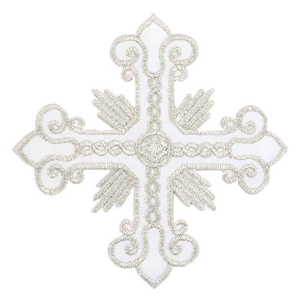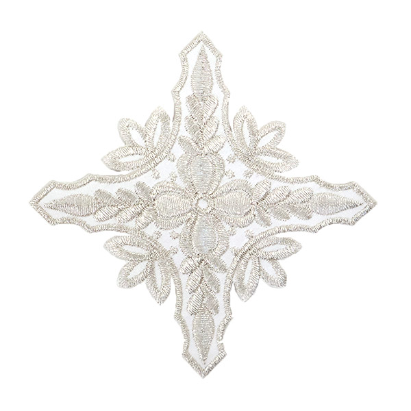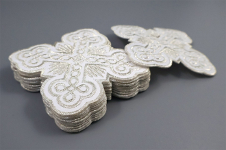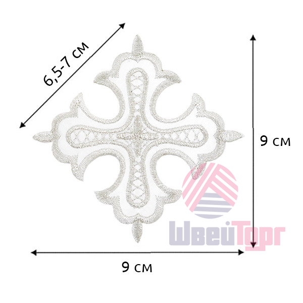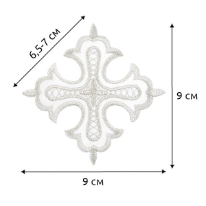 Термоаппликация в форме креста размером 7×7 см представляет собой вышивку металлизированной нитью на плотной синтетической основе. С изнаночной стороны - клеевой слой. Цвет - серебро.
