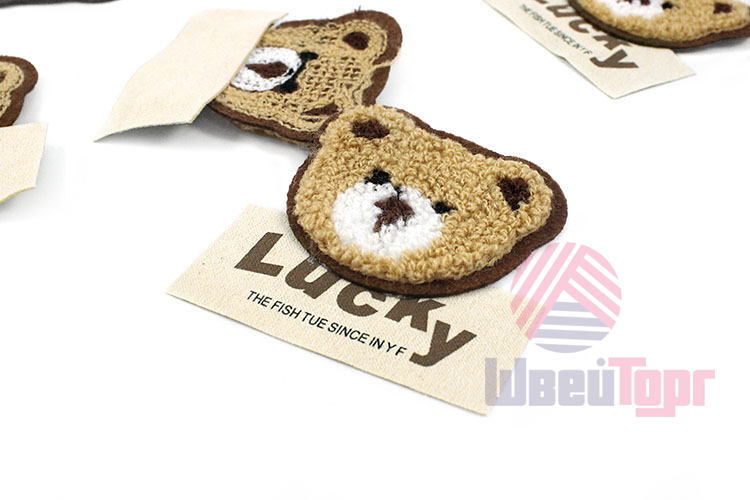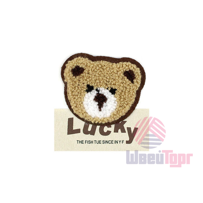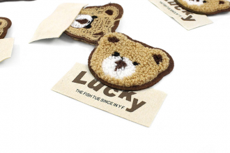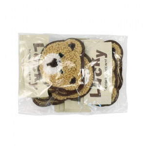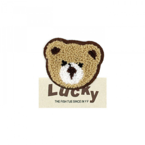 Очаровательная пришивная бирка. Уникальный аксессуар, в виде прямоугольной основы с надписью "Lucky", и плюшевой головы медвежонка, которая тактильно приятна и выполнена в нежных коричневых оттенках.