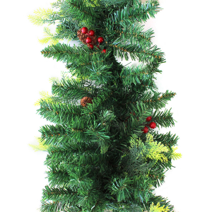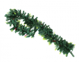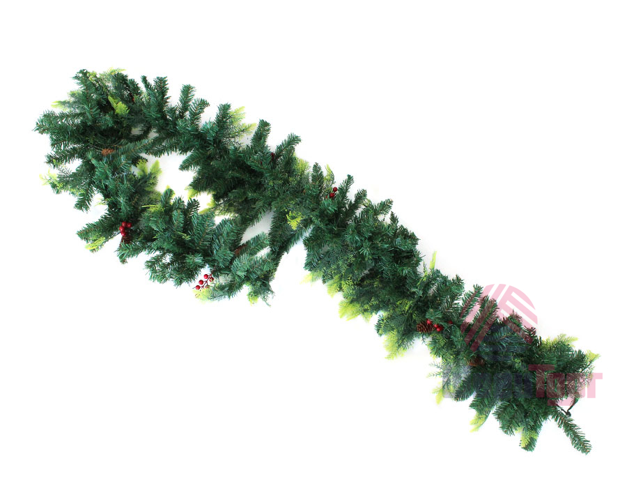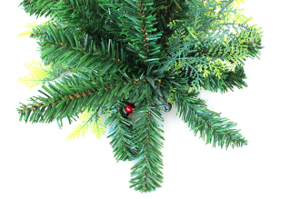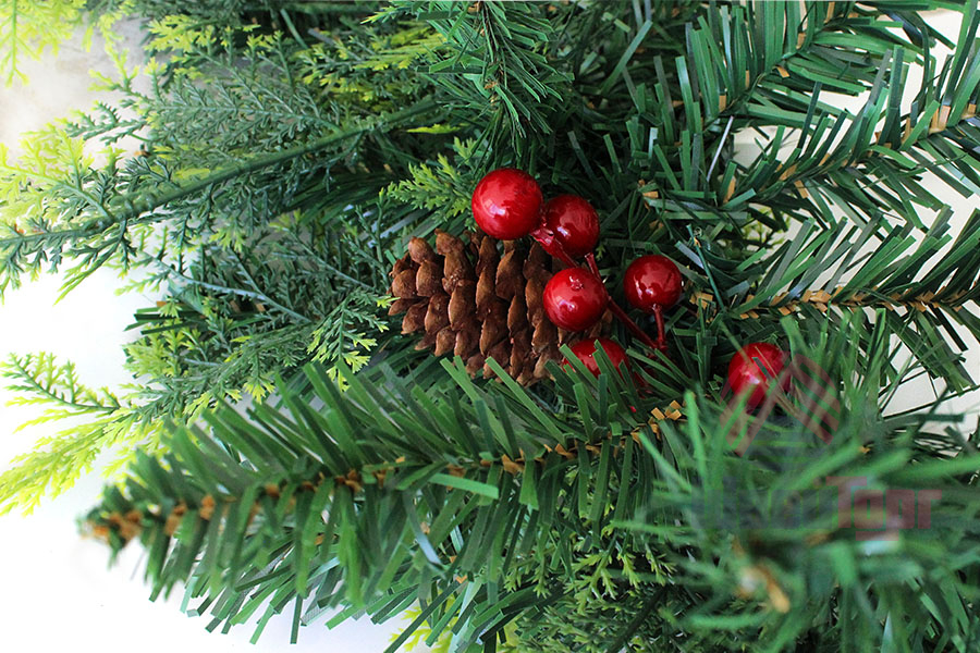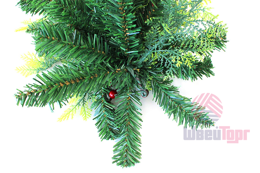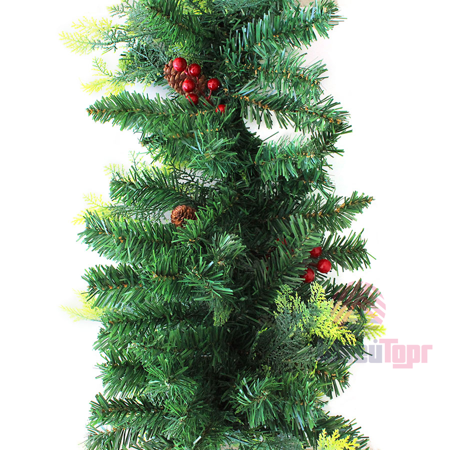 Новогодний декор в виде ветви с хвоей, шишками и красными ягодами. Гибкая основа с проволокой и подвесом позволяет придать форму и зафиксировать декор в нужном положении.