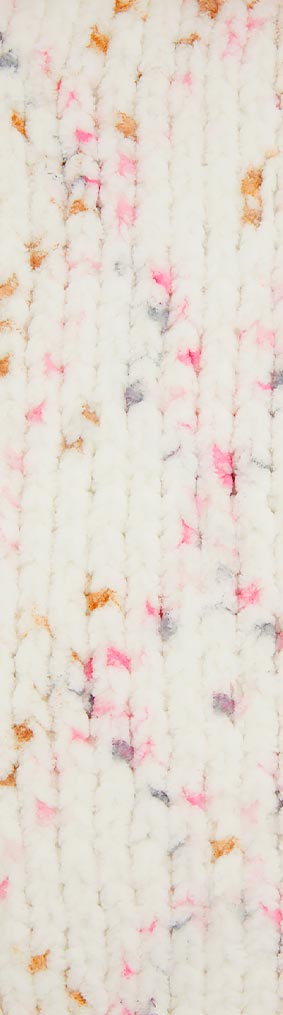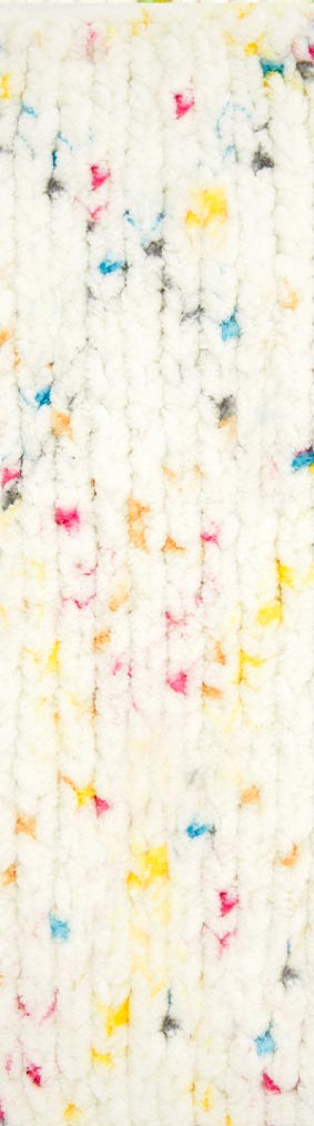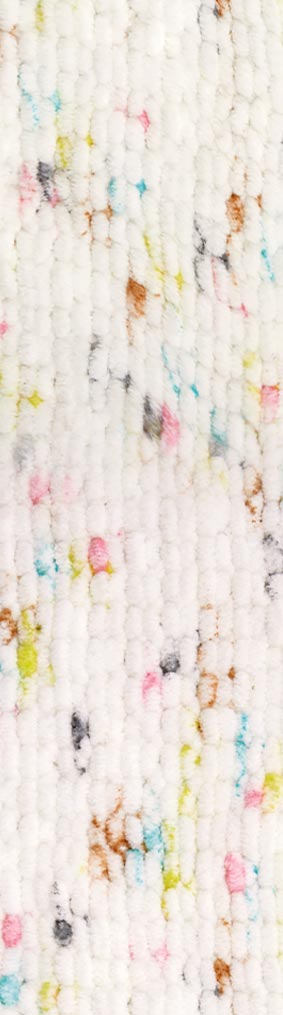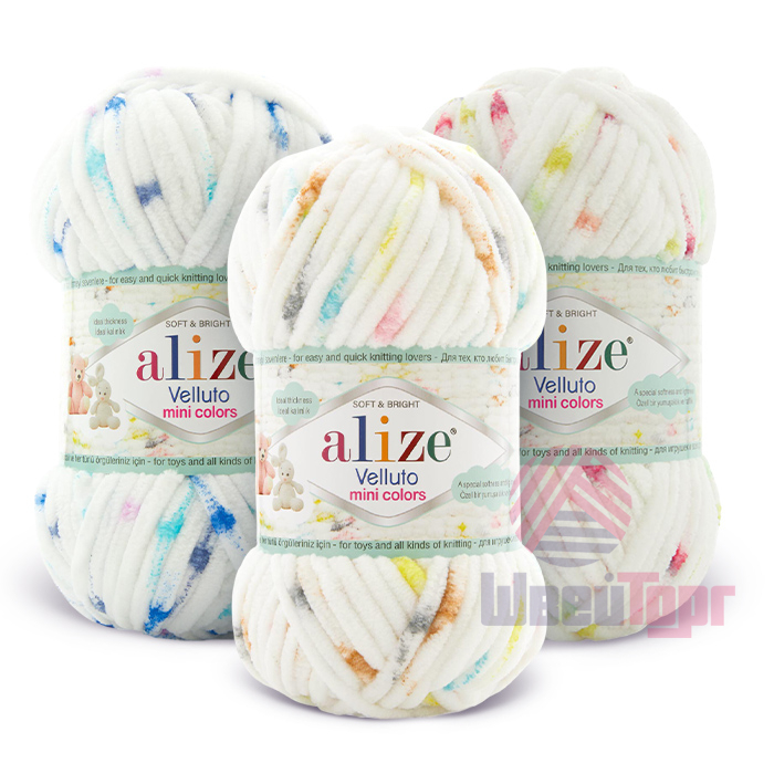 Пряжа Alize Velluto Mini Colors — секционно окрашенный аналог плюшевой Velluto с твидовым эффектом: на светлом фоне разноцветные крапинки. Мягкий велюровый ворс (100% микрополиэстер) идеален для игрушек амигуруми, детских пледов и аксессуаров. Не требует сложных узоров, подходит начинающим, готовые работы выглядят профессионально. Отличие от классической версии — многоцветная окраска вместо однотонной.
