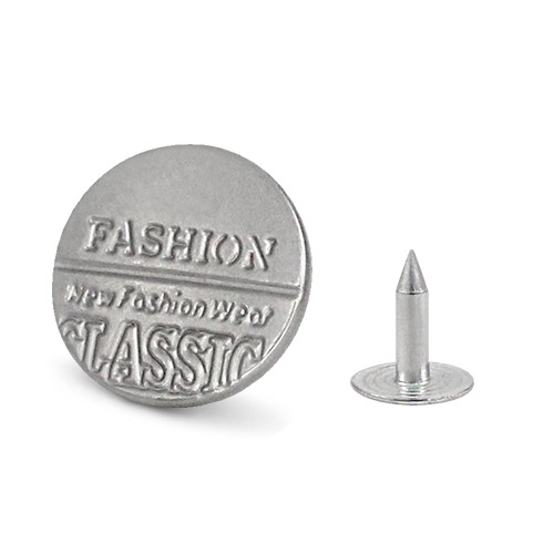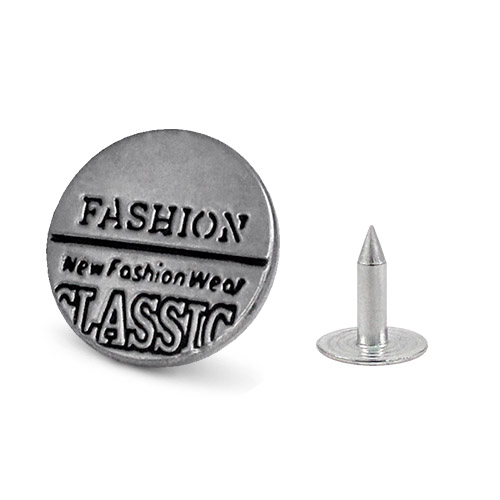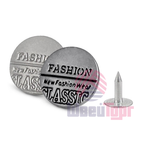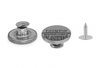 Стильная металлическая пуговица, представлена в двух цветах – матовый никель и тёмный матовый никель. Пуговица имеет плоскую форму и гравировку в виде надписей "FASHION CLASSIC". Эта пуговица станет стильным завершающим штрихом для ваших изделий из джинсы, будь то джинсы, джинсовые шорты или джинсовые куртки. В комплект входят надёжные гвоздики для крепления.
