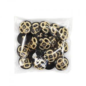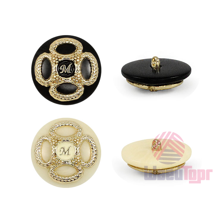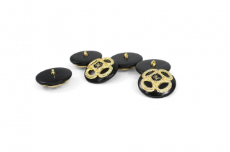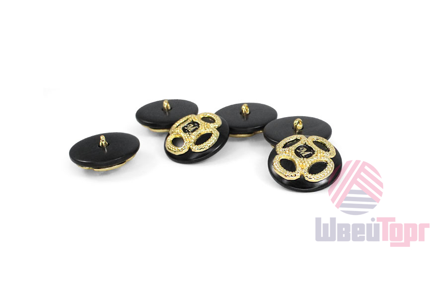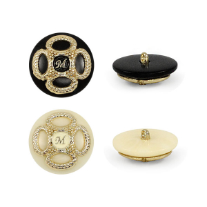 Пластиковая пуговица на ножке с шикарным золотым декором. В центре – буква «M» в обрамлении симметричного позолоченного узора. Доступна в двух классических сочетаниях: крем с золотом и чёрный с золотом. Яркий акцент для создания смелого образа.