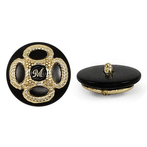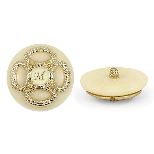 Пластиковая пуговица на ножке с шикарным золотым декором. В центре – буква «M» в обрамлении симметричного позолоченного узора. Доступна в двух классических сочетаниях: крем с золотом и чёрный с золотом. Яркий акцент для создания смелого образа.