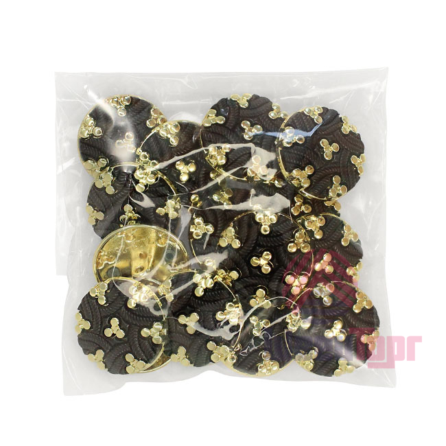 Эта металлическая пуговица на ножке приятно удивляет своим малым весом, сочетающимся с ощутимой прочностью. Её главная особенность – выразительный декор: фактурные переплетающиеся элементы из чёрного пластика контрастируют с яркими золотистыми вставками, создавая динамичный и запоминающийся облик.