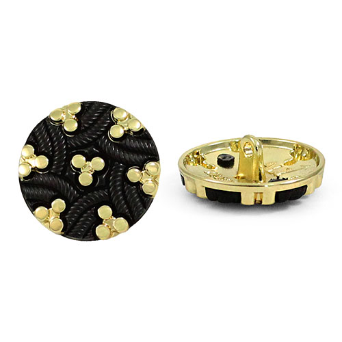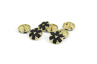 Эта металлическая пуговица на ножке приятно удивляет своим малым весом, сочетающимся с ощутимой прочностью. Её главная особенность – выразительный декор: фактурные переплетающиеся элементы из чёрного пластика контрастируют с яркими золотистыми вставками, создавая динамичный и запоминающийся облик.