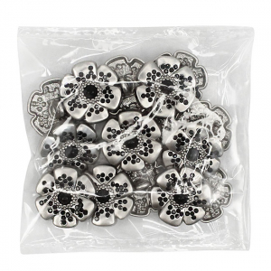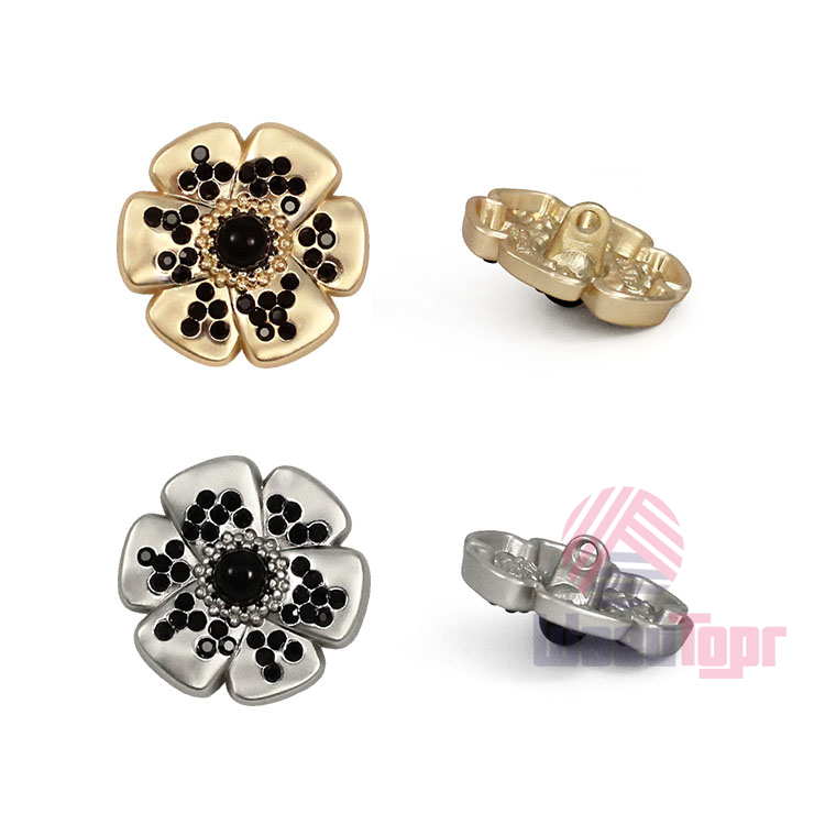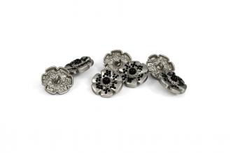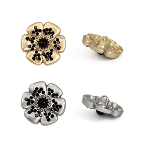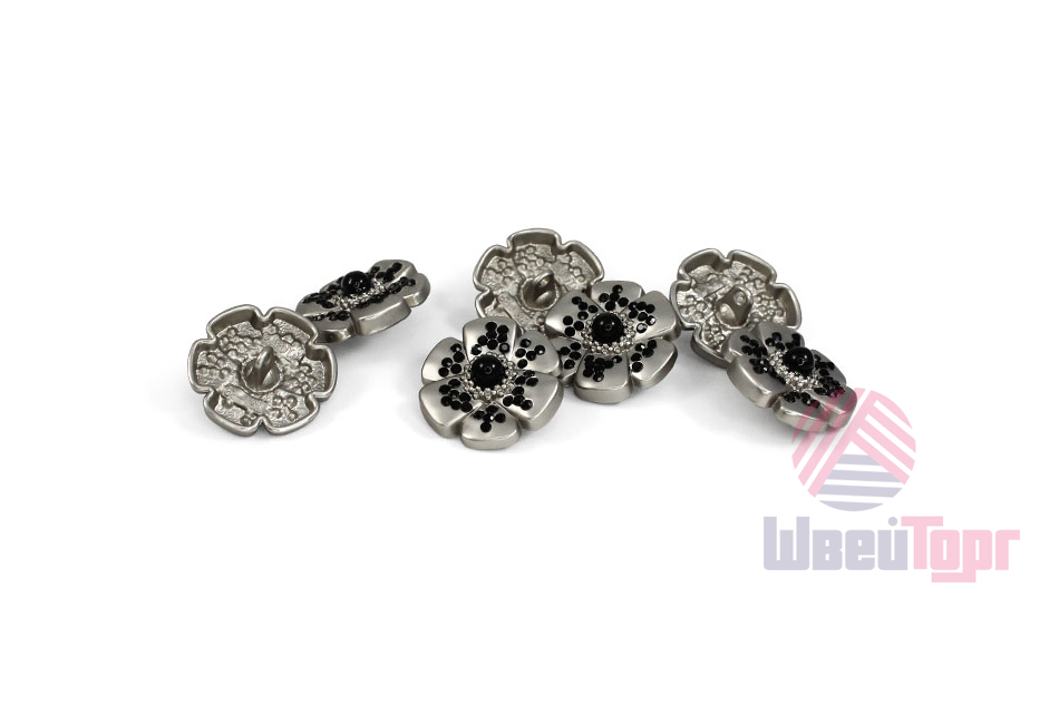 Эта металлическая пуговица на ножке, выполненная в форме цветка с контрастными чёрными стразами, станет стильным акцентом для ваших изделий. Пуговицы представлены в базовых цветах – матовое серебро и матовое золото, оба варианта отлично сочетаются с контрастным чёрным декором. Эти пуговицы великолепно украсят костюм или жакет.