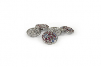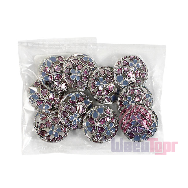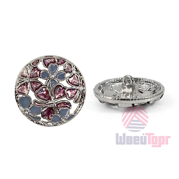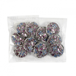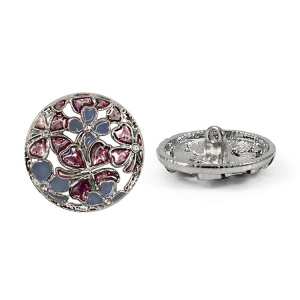 Позвольте вашему наряду расцвести! Эта металлическая пуговица напоминает драгоценную миниатюру. Её сложный, резной дизайн завораживает: основа из серебристого металла подобно кружевной ленте обрамляет нежный букет. Ажурная резьба, образующая букет из голубых и пурпурных соцветий, и лёгкое сияние блёсток делают их маленьким шедевром.