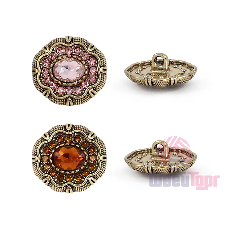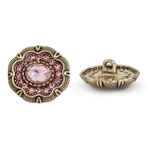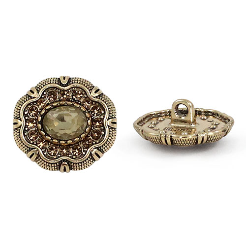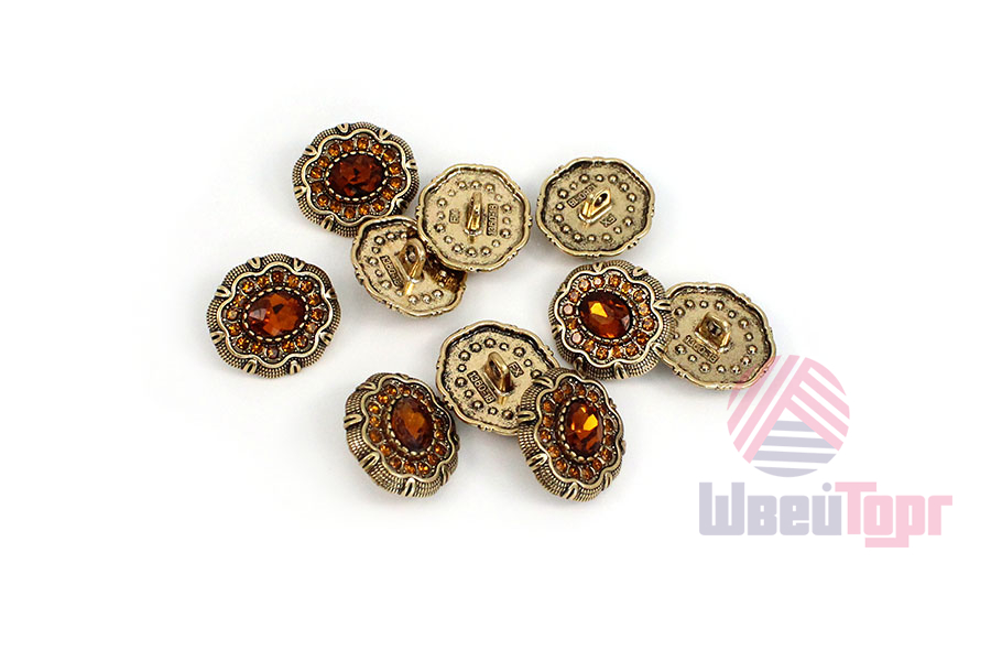Эта пуговица на ножке станет изысканным завершающим штрихом для вашего изделия. Металлическая основа оттенка «тёмное золото» служит изящной оправой для роскошной композиции: в центре сияет крупная гранёная бусина, имитирующая драгоценный камень, а её блеск многократно усиливается за счёт ореола из мелких сверкающих стразов. Идеальный выбор для вечерних жакетов и костюмов, она представлена в пяти богатых расцветках: топаз, зелёный, розовый, кофе и чёрный.