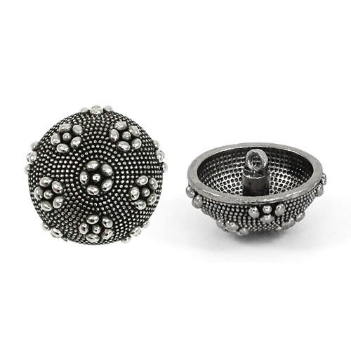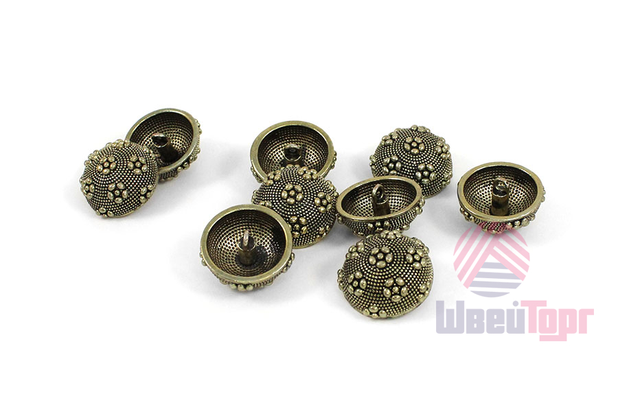 Металлическая пуговица на ножке, диаметр 22 мм, выпуклая форма. У пуговицы оригинальная форма и дизайн - фактурная поверхность, украшенная стилизованными цветками из шариков.