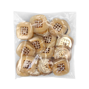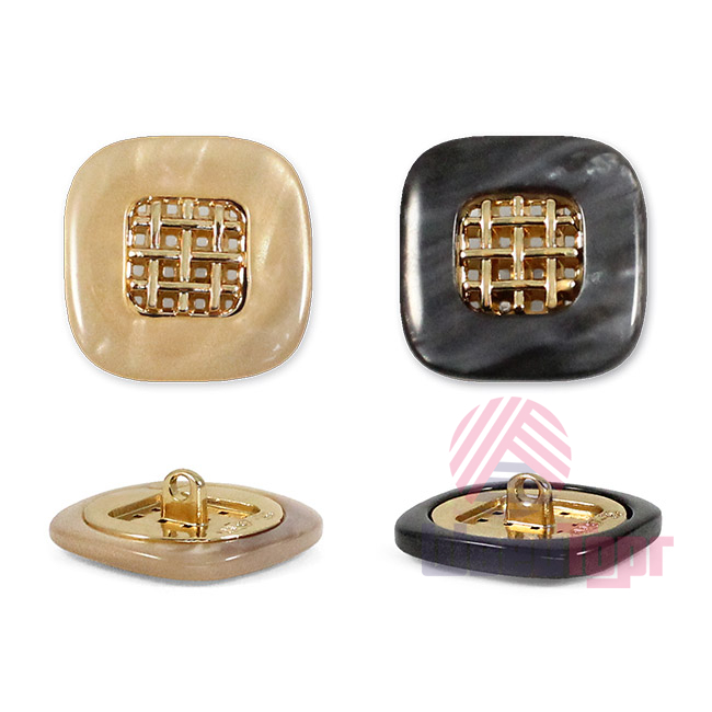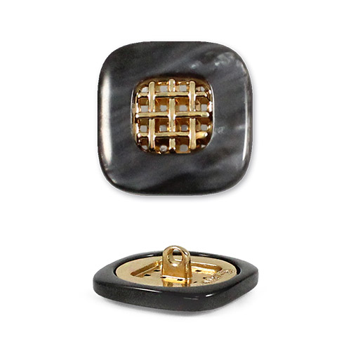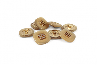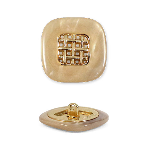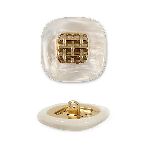 Эта пуговица из пластика с лёгким перламутровым эффектом привлечёт внимание изящной деталью: в центре квадрата, с мягко скруглёнными углами, расположена изысканная золотая решётчатая вставка.