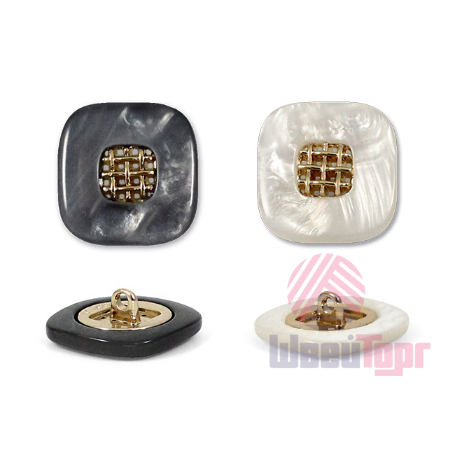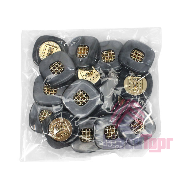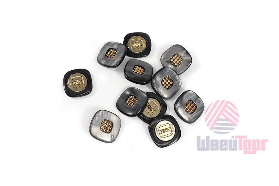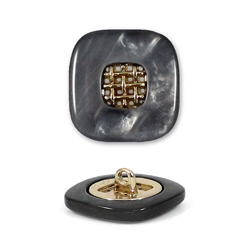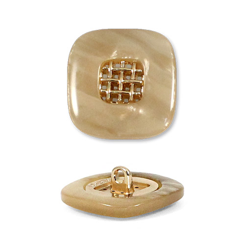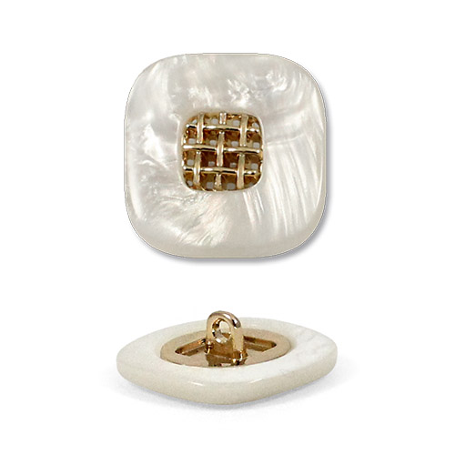 Эта пуговица из пластика с лёгким перламутровым эффектом привлечёт внимание изящной деталью: в центре квадрата, с мягко скруглёнными углами, расположена изысканная золотая решётчатая вставка.