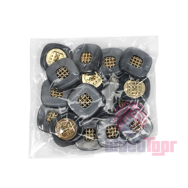 Эта пуговица из пластика с лёгким перламутровым эффектом привлечёт внимание изящной деталью: в центре квадрата, с мягко скруглёнными углами, расположена изысканная золотая решётчатая вставка.