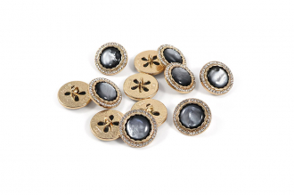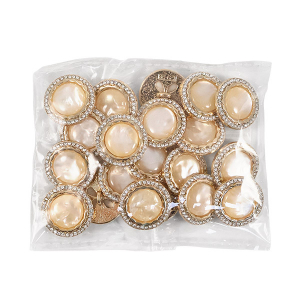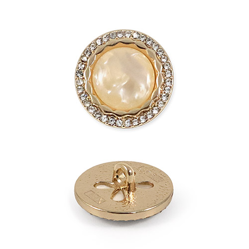 Эта металлическая пуговица диаметром 17 мм на удобной ножке, станет яркой деталью для вашего жакета или костюма. Её золотистая основа по краю украшена россыпью мелких стразов, а центральная выпуклая вставка из акрила, переливающаяся перламутром, добавляет объём и игру света.
