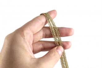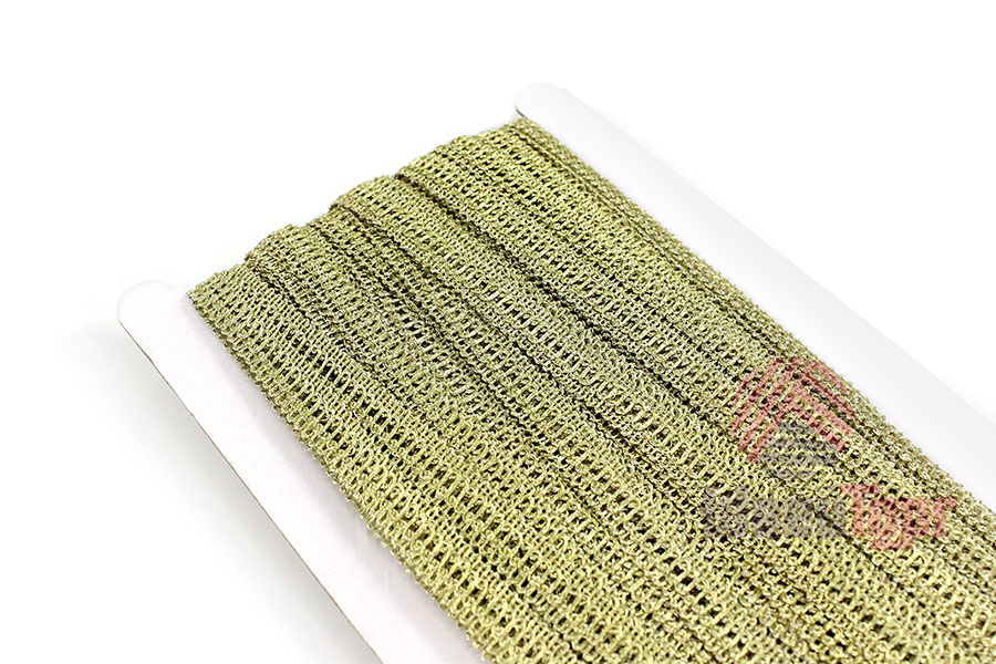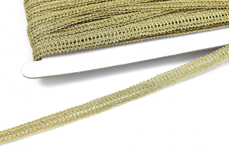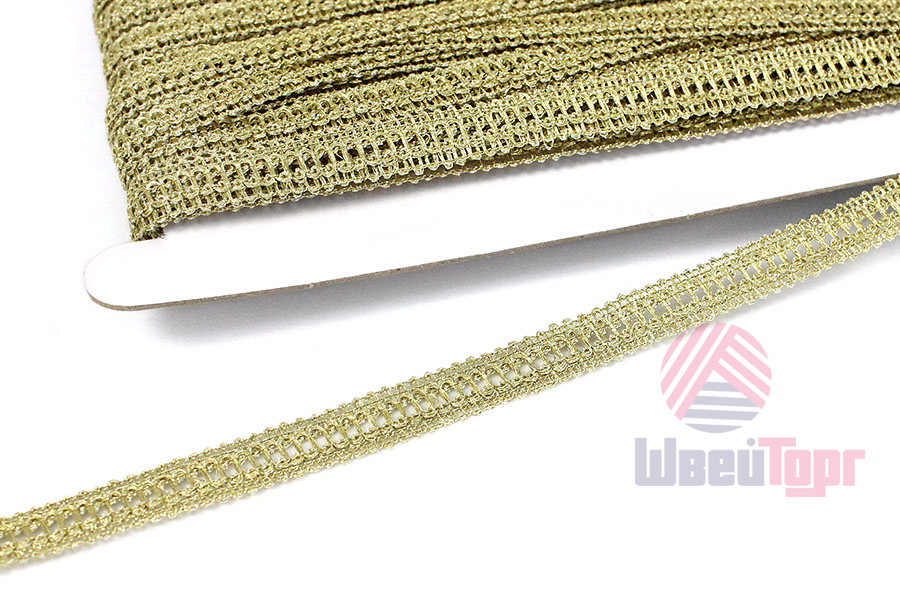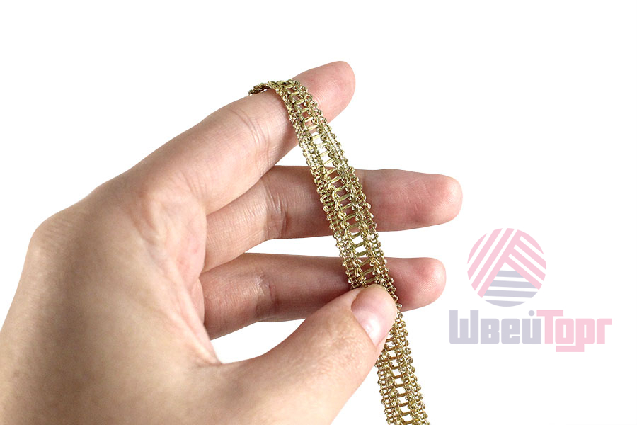 Тесьма доступна в холодном, золотом цвете. Она идеально подходит для отделки одежды, декора сценических костюмов, а также для украшения головных уборов и элементов интерьера. Представляет собой прочную плетёную, рельефную тесьму с повторяющимся геометрическим узором. Тесьма пронизана металлизированными нитями, что придаёт ей уникальный блеск. Создавайте свои неповторимые изделия!