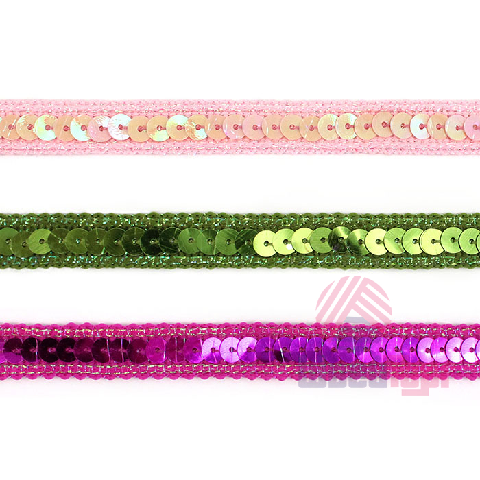 Декоративная тесьма с пайетками служит акцентной отделкой для разнообразных проектов, от скрапбукинга до пошива национальных и сценических костюмов. Плетение тесьмы создаёт красивый узор, а добавление пайеток придаёт мерцающий эффект.