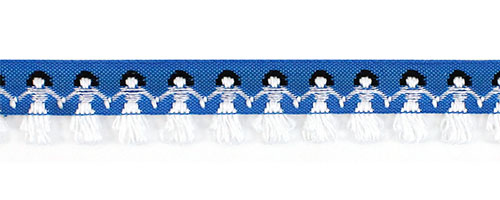 Данная тесьма с узором станет акцентной декоративной отделкой для разнообразных проектов, от скрапбукинга до пошива национальных и сценических костюмов. У тесьмы оригинальный дизайн в виде стилизованных фигурок, держащихся за ручки.
