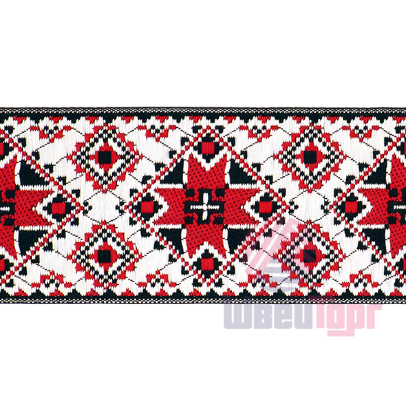 Данная жаккардовая тесьма обладает высокой прочностью, устойчива к растяжению и истиранию. Так как рисунок формируется непосредственно в процессе плетения, что придаёт тесьме эффект вышивки, тесьма сохраняет яркость цветов и не теряет своего внешнего вида долгое время. Рельефный узор тесьмы представляет собой геометрический орнамент. Благодаря высококачественному полиэстеру, из которого она изготовлена, тесьма сохраняет насыщенность цветов даже при частом использовании.