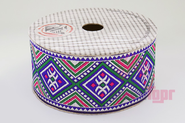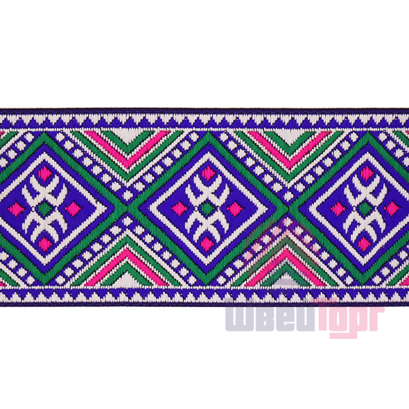 Данная жаккардовая тесьма обладает высокой прочностью, устойчива к растяжению и истиранию. Так как рисунок формируется непосредственно в процессе плетения, что придаёт тесьме эффект вышивки, тесьма сохраняет яркость цветов и не теряет своего внешнего вида долгое время. Рельефный узор тесьмы представляет собой геометрический орнамент. Благодаря высококачественному полиэстеру, из которого она изготовлена, тесьма сохраняет насыщенность цветов даже при частом использовании.