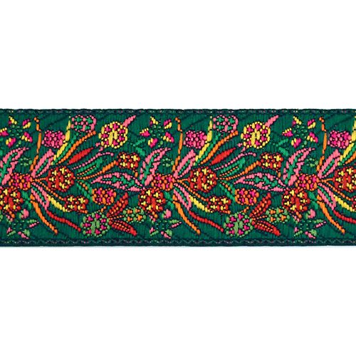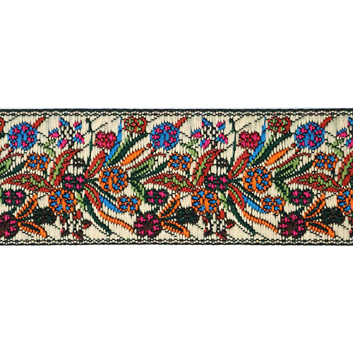 Данная жаккардовая тесьма обладает высокой прочностью, устойчива к растяжению и истиранию. Рисунок формируется непосредственно в процессе плетения, что придаёт тесьме эффект вышивки. Благодаря высококачественному полиэстеру тесьма сохраняет яркость цветов и не теряет своего внешнего вида долгое время.